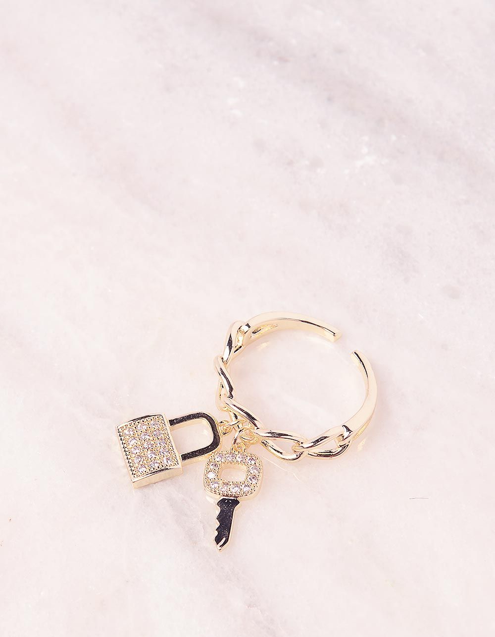 Кільце з підвіскою у вигляді замка та ключика у стразах