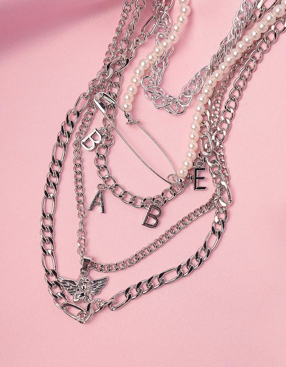 Підвіска на шию багатошарова із ланцюгів та перлин з булавкою і написом BABY