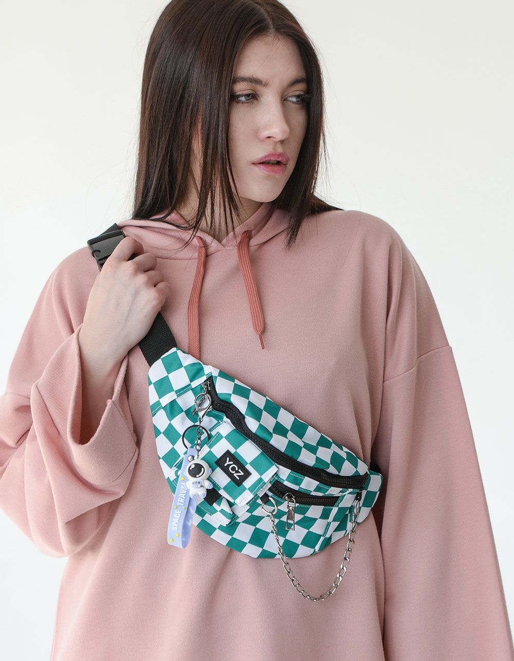 Сумка бананка у клітинку з брелоком у вигляді космонавта