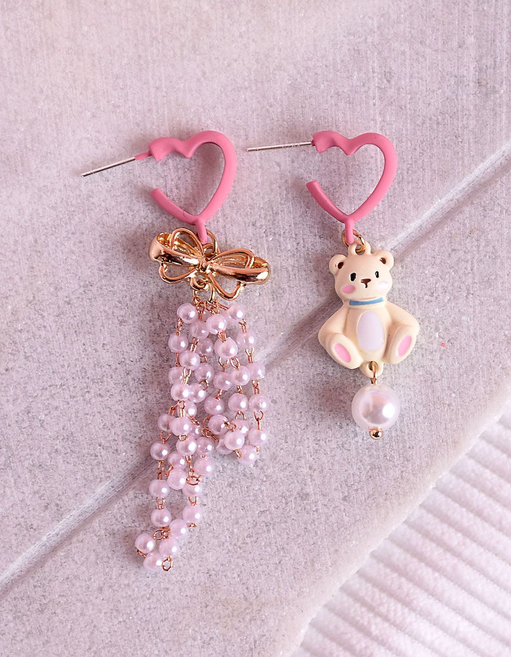 Сережки довгі у вигляді сердець з ведмедиком та перлинами