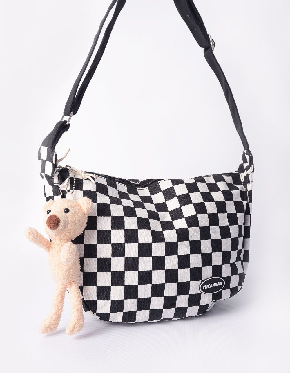 Сумка через плече у клітинку з брелоком у вигляді ведмедика