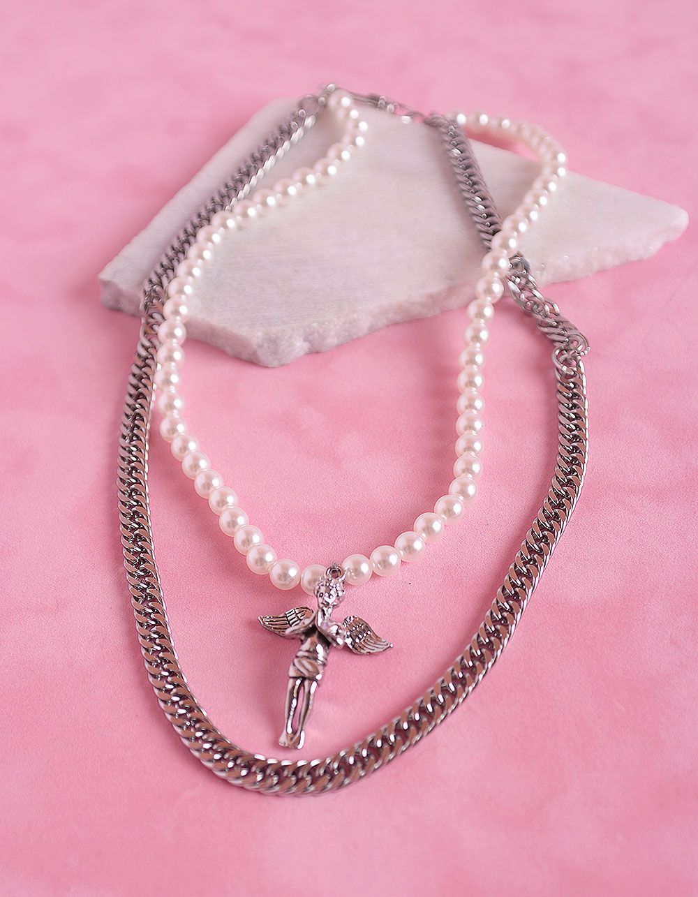Підвіска на шию подвійна із перлин та ланцюжка з кулоном у вигляді янгола