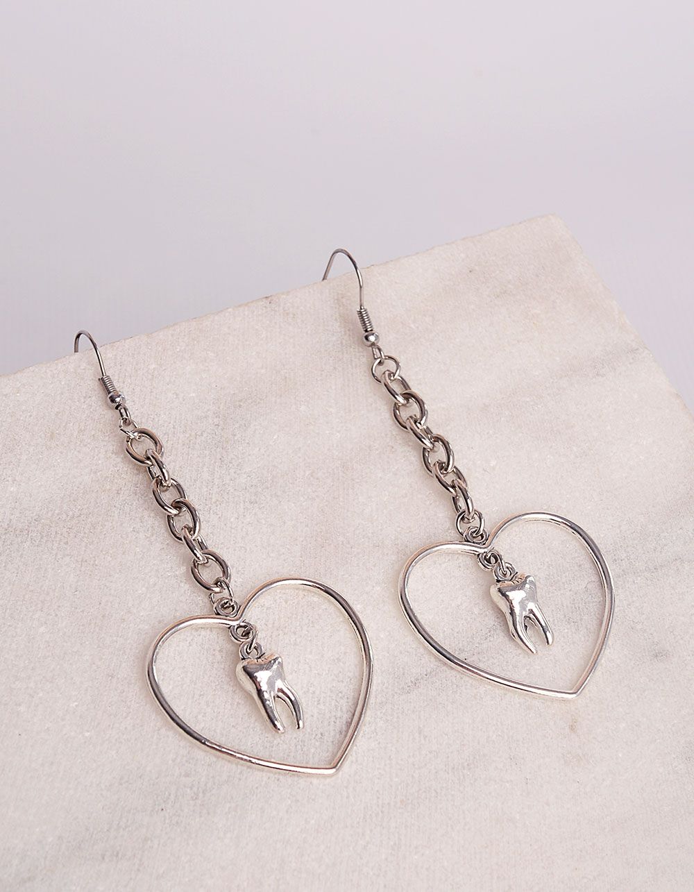 Сережки із ланцюжків з серцем та зубом