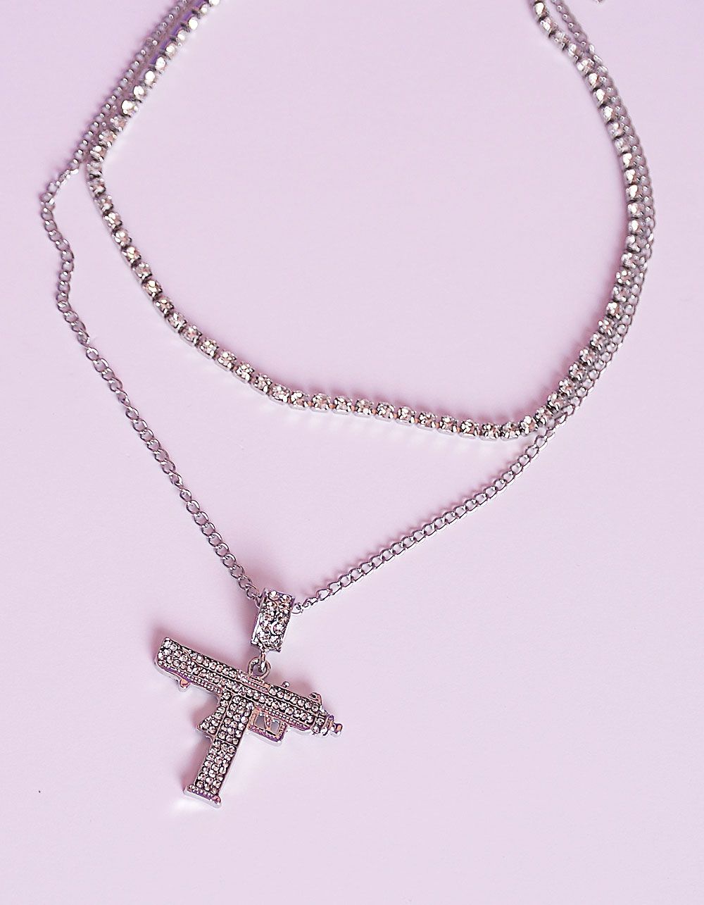 Підвіска на шию подвійна з кулоном у вигляді кулимета у стразах