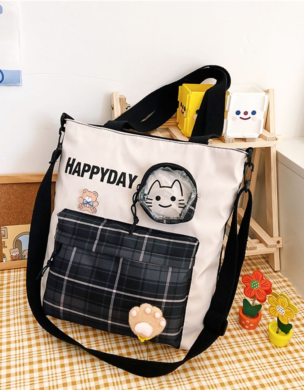 Сумка шопер з принтом котика та значками у вигляді ведмедика та лапки