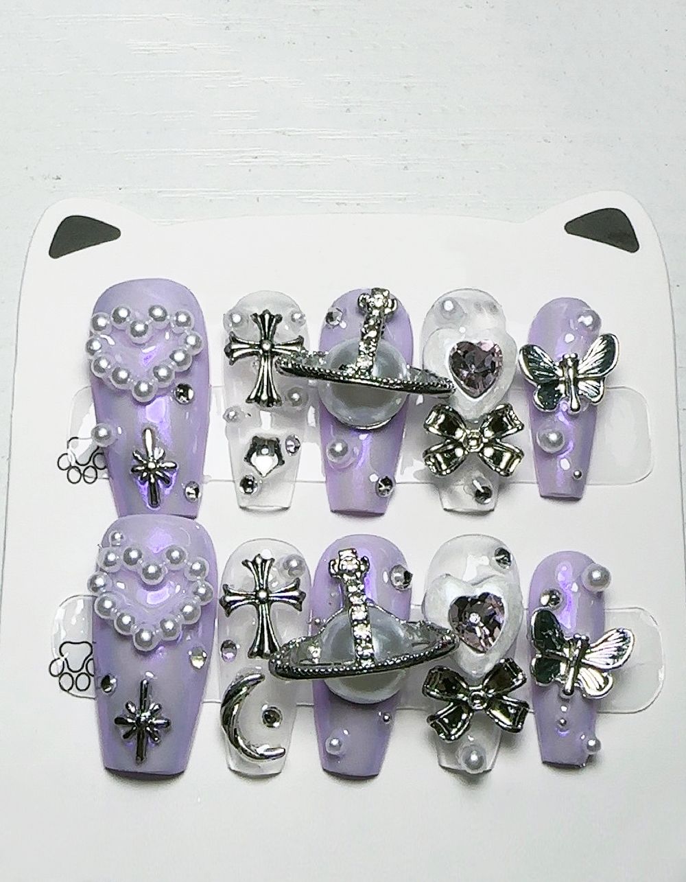 Нігті накладні декоровані перлинами з бантом та серцем