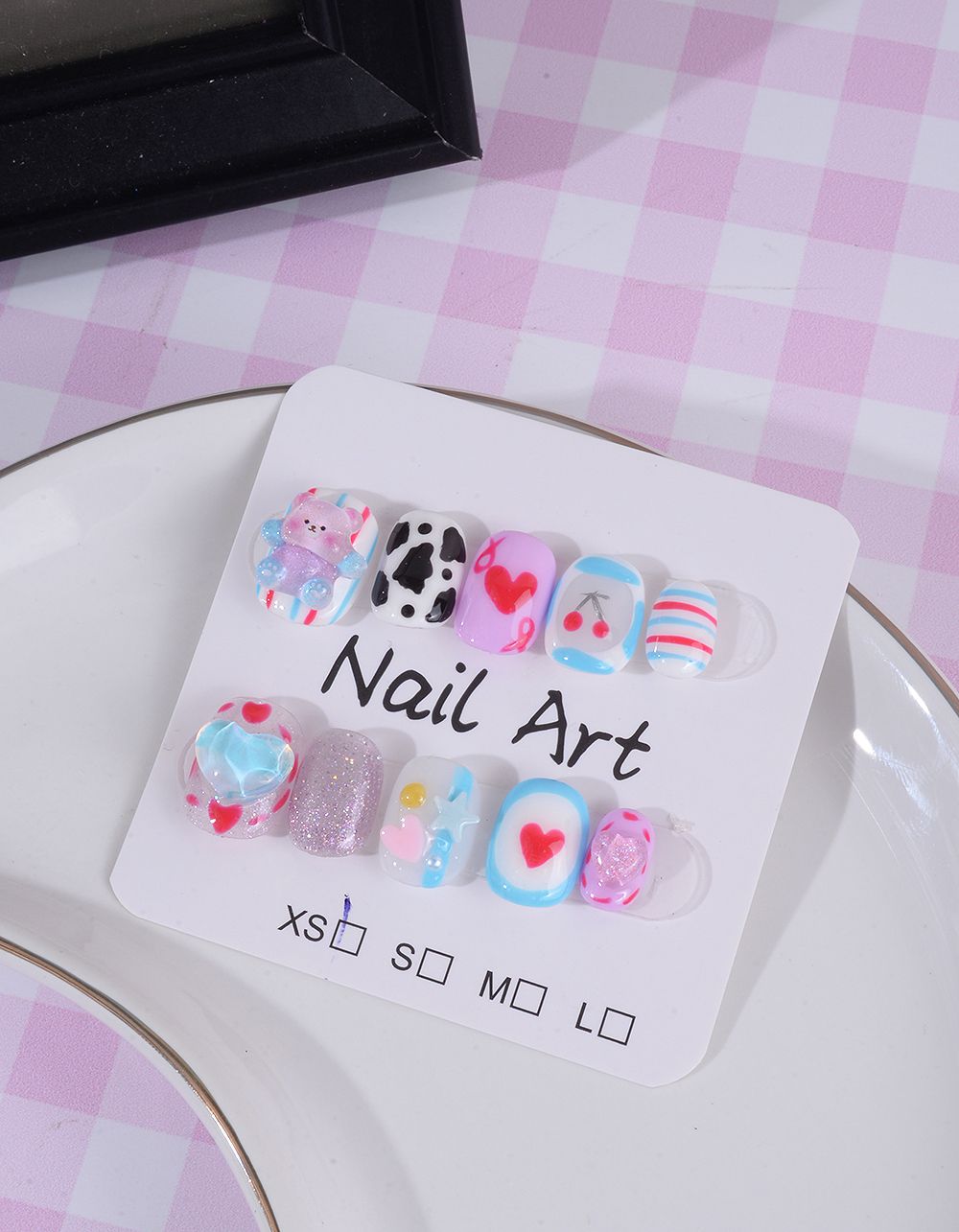 Нігті накладні з ведмедиком та серцями