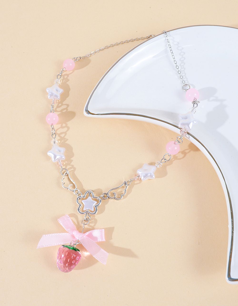 Підвіска на шию з кулоном у вигляді полуниці з бантом та перлинами у вигляді зірок