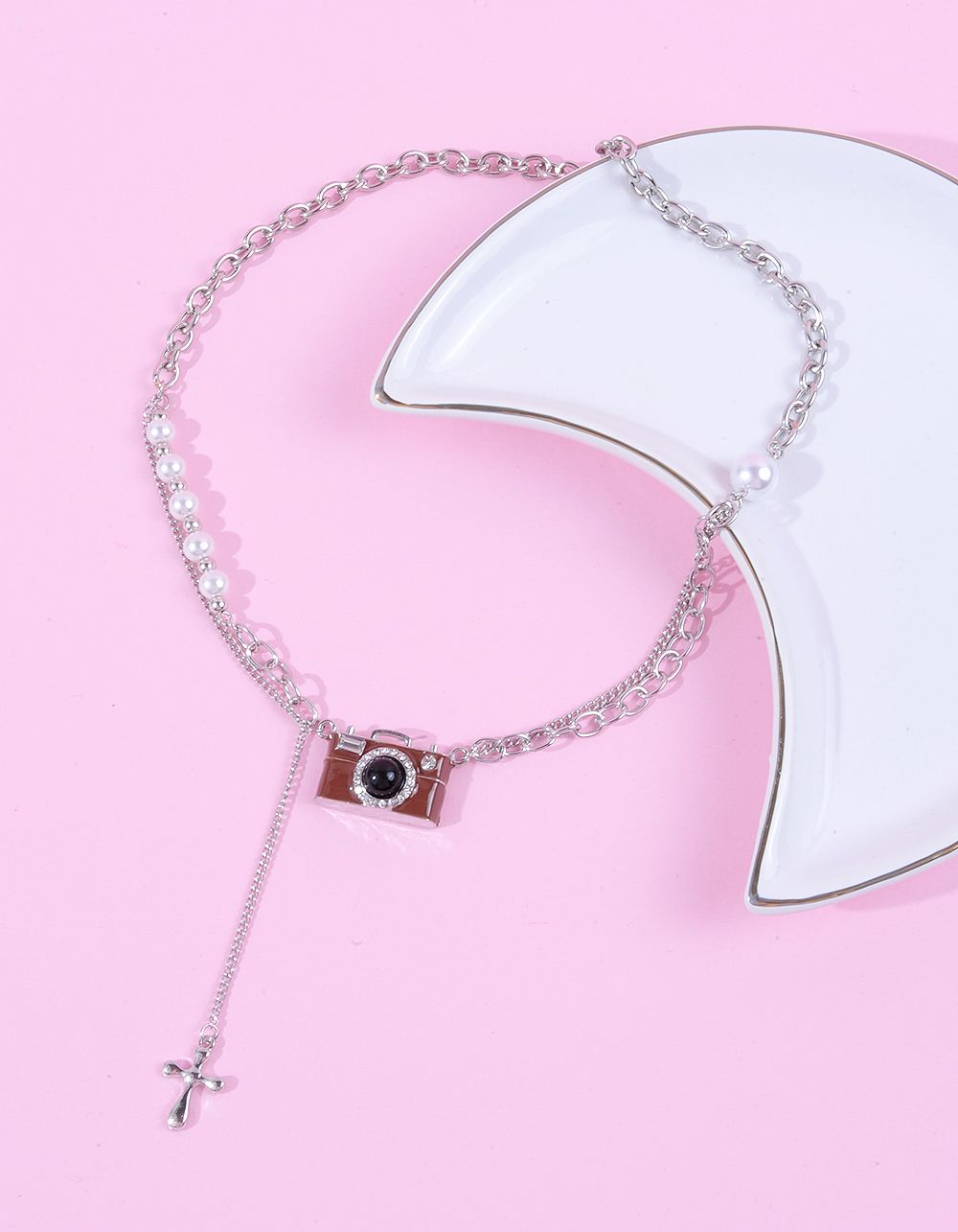 Підвіска на шию із ланцюжків з перлинами з кулоном у вигляді фотокамери та хреста