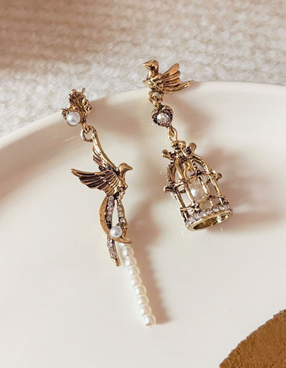 Сережки довгі у вигляді птаха з перлинами та клітки