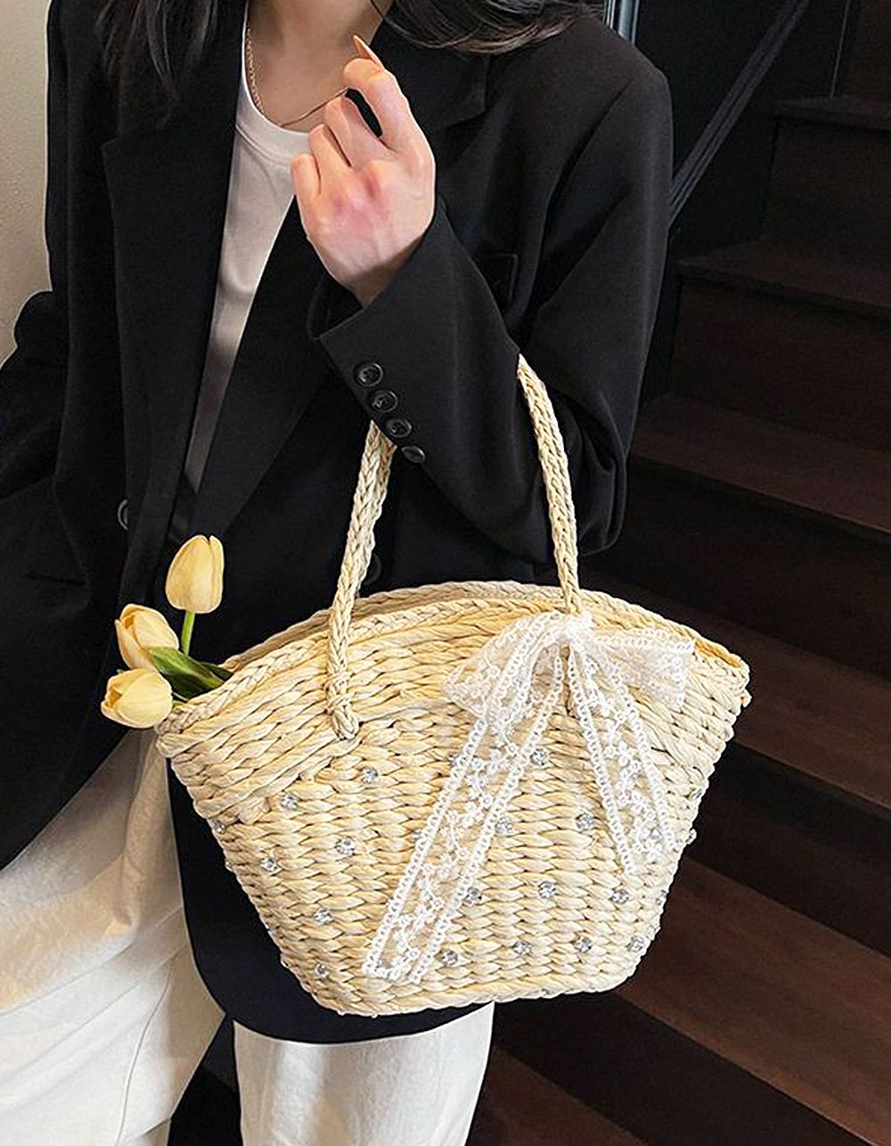 Сумка шопер зі штучної соломи з мереживним бантом у стразах