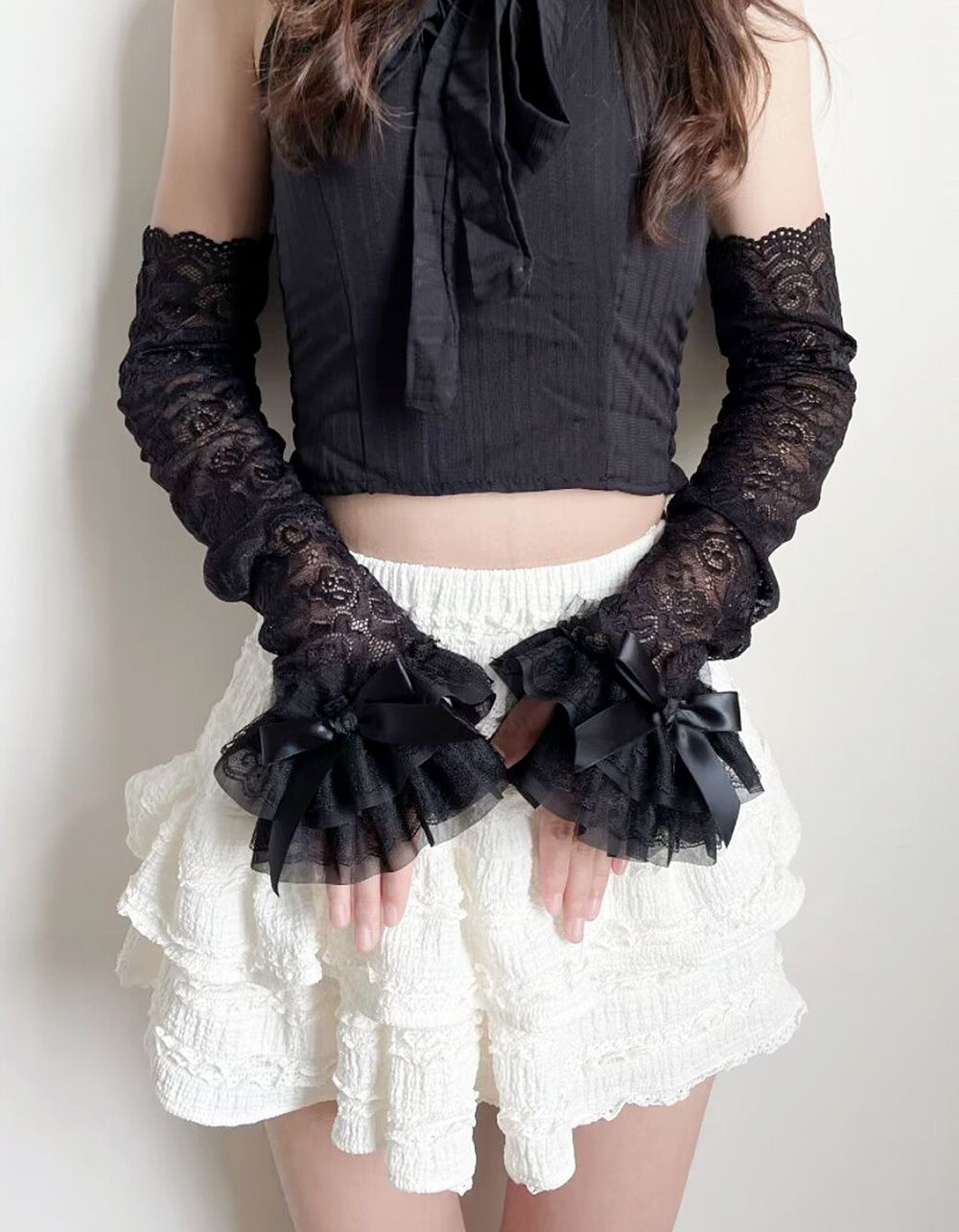 Мітенки високі мереживні з бантом
