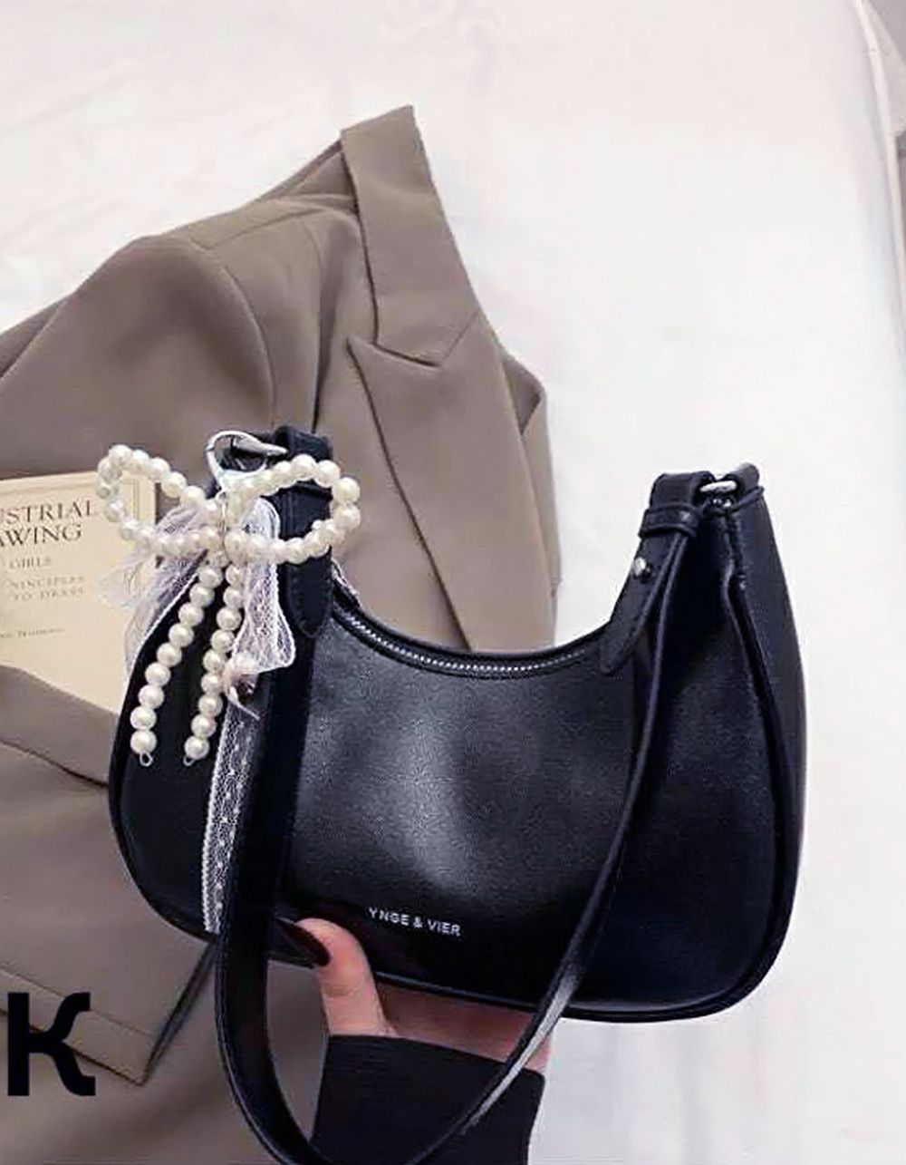 Сумка багет з мереживом та бантом із перлин